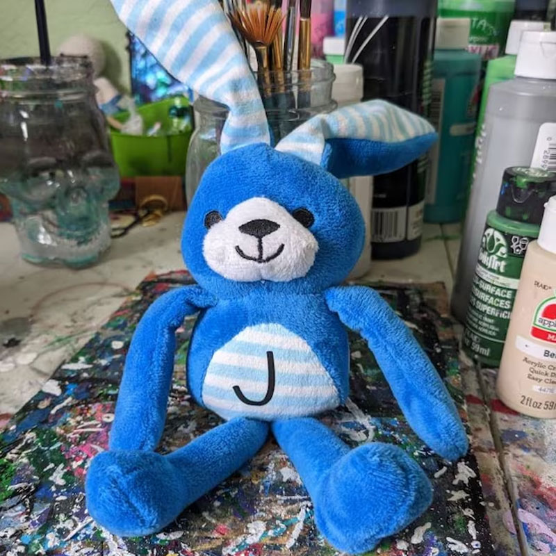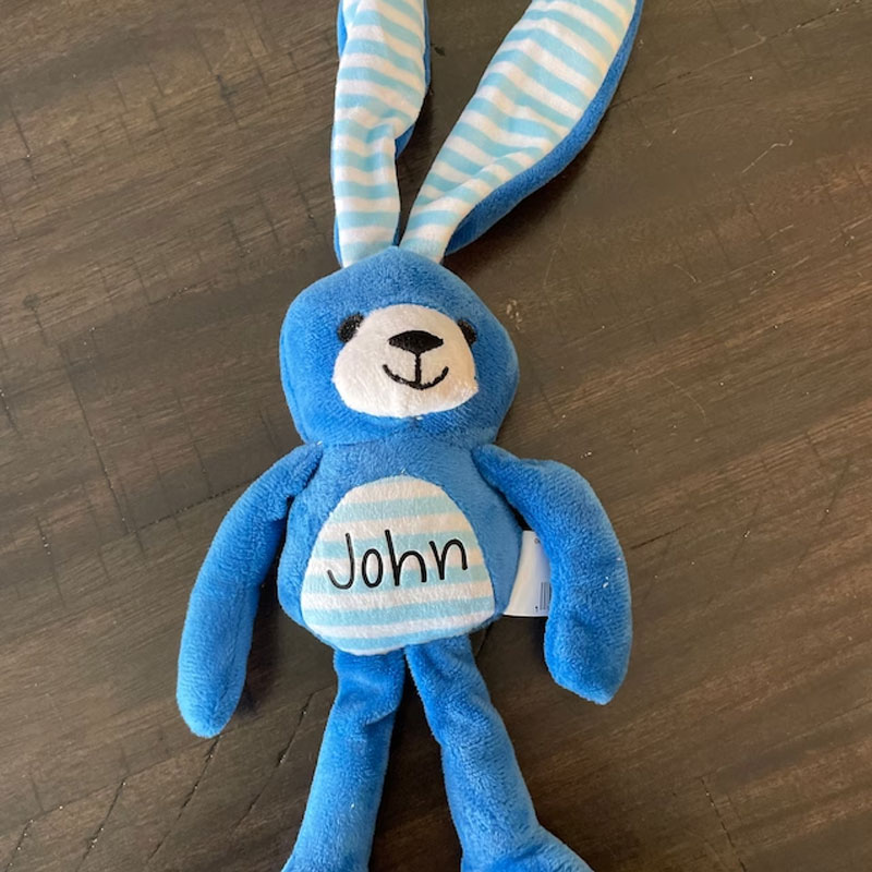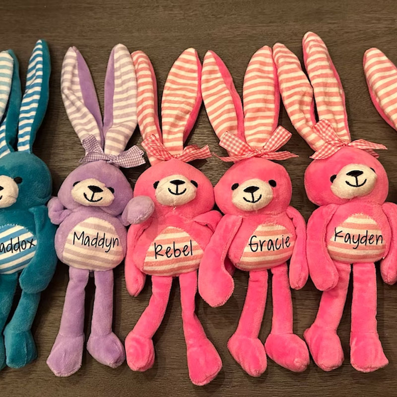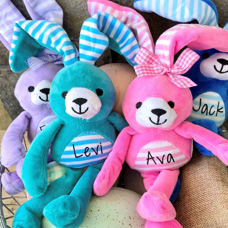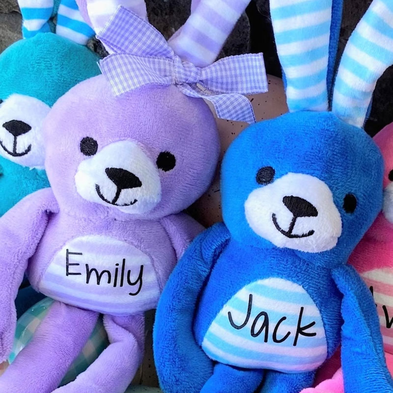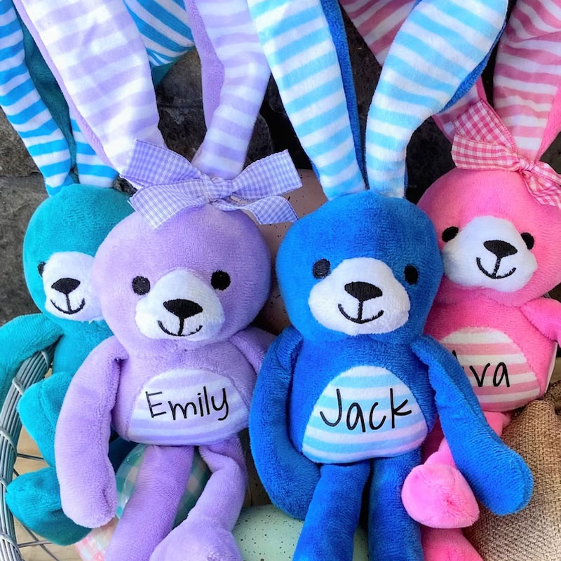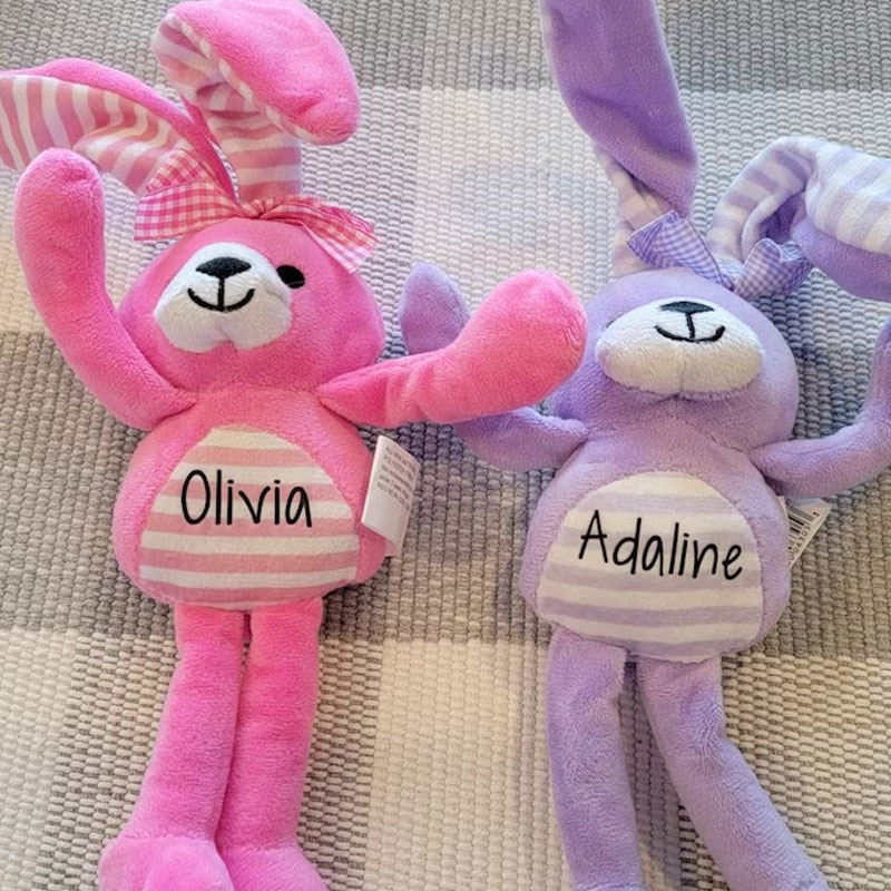 ♥ These bunnies come in pink, purple, teal and blue. Each is personalized with your child's name in black. The pink & purple bunnies will have a cute gingham bow as shown in photos (unless you reqest "no bow").