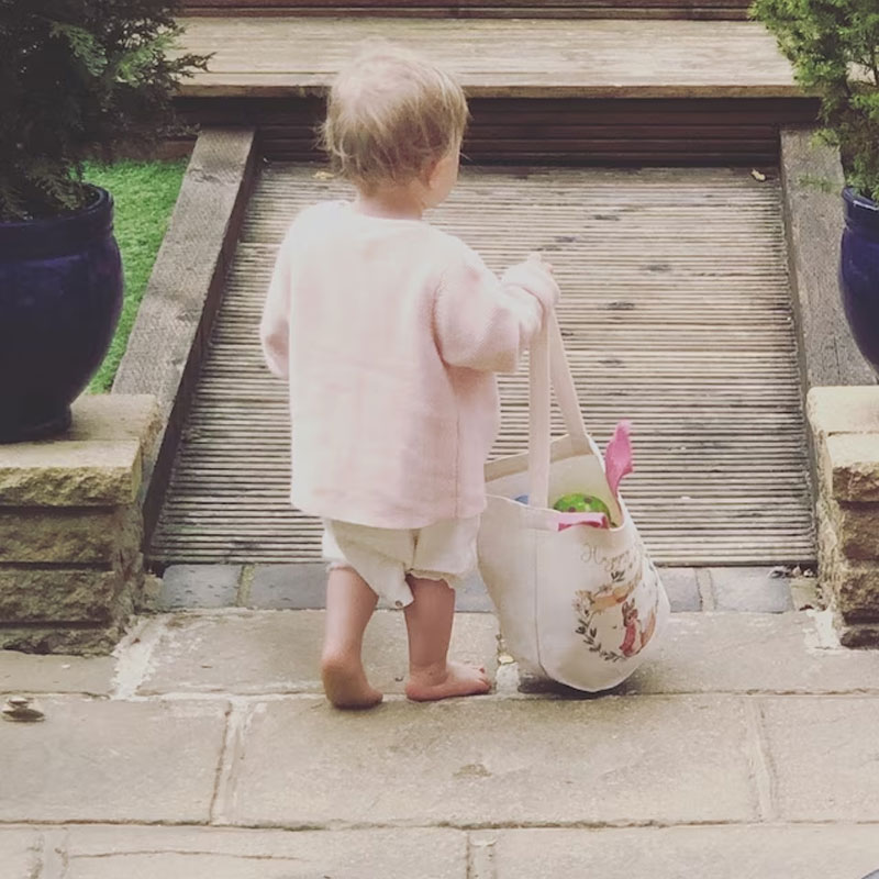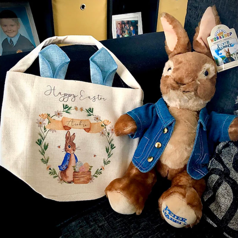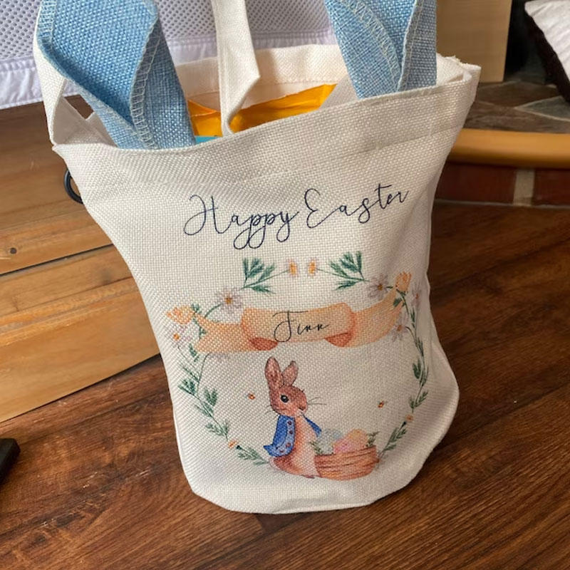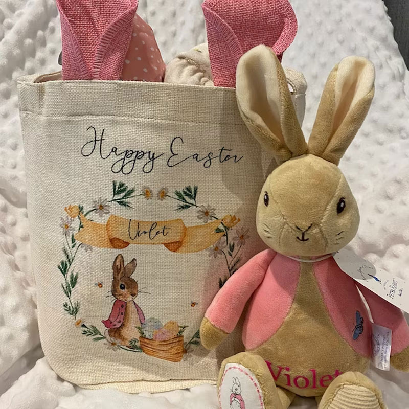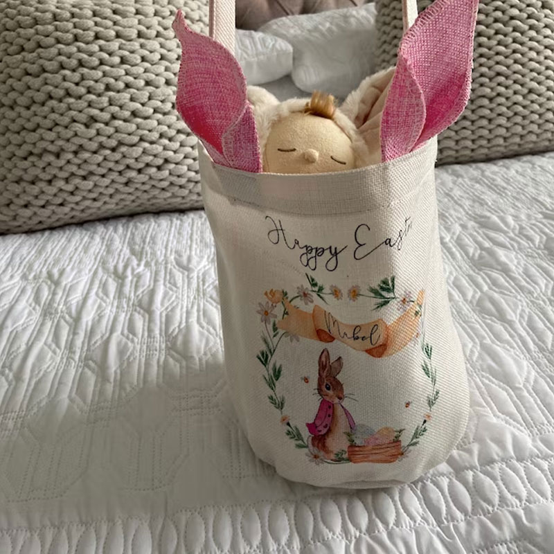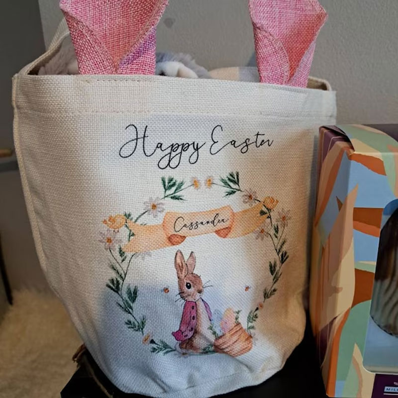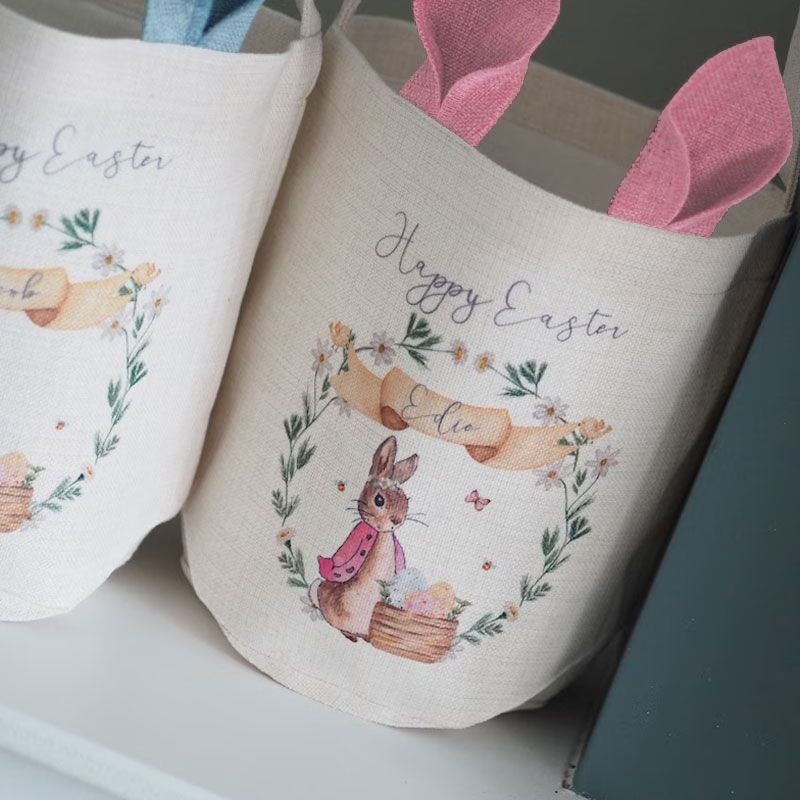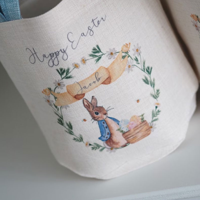 These linen bags are 20x25cm, they boasts an easter Peter rabbit design with pink or blue ears.