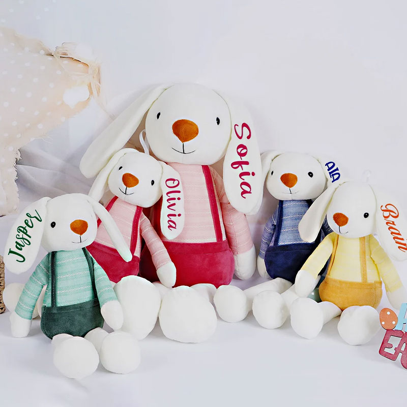 In the upcoming Easter, preparing cute bunny dolls with their own names for children will be a unique Easter gift.   The pink rabbit is playful and cute, the yellow rabbit is lively and cheerful, the green rabbit is playful and amusing, and the blue rabbit is refreshing and cute.