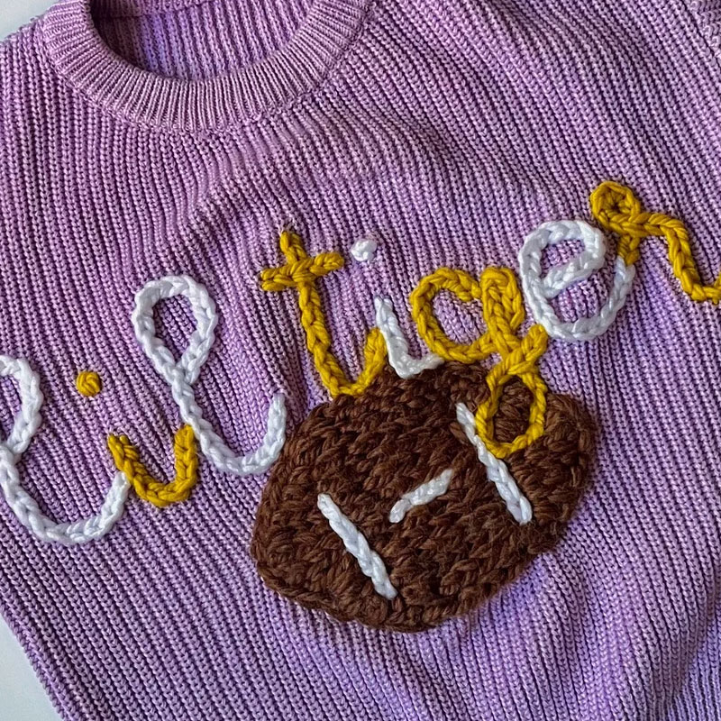 In addition, state the color you'd like the team name to be written in. If you would like any yarn colors other than the team colors, you must specify in the personalization box.