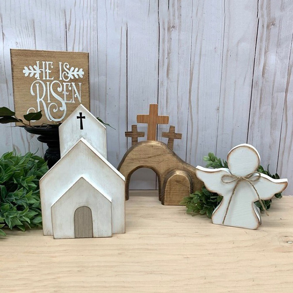• Ex Large Tomb w/cross 12" X 8", Large Tomb 8" wide, Small Tomb 6" wide, Church 8" X 5", Sign 5", Angel 4 1/2" & 5 1/2"