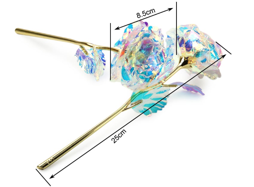 Finally, we cover them in an iridescent holographic coating to make the rose PVC stem and PVC petals sparkle in the light. Then we hand place each iridescent holographic coated petal which makes the roses look so eye-catching!