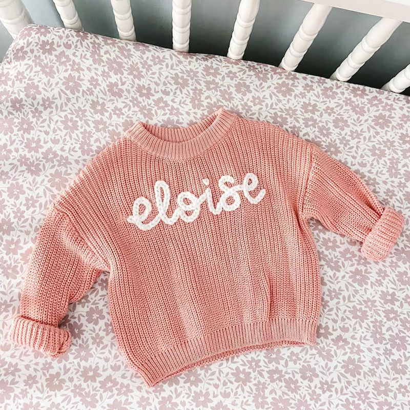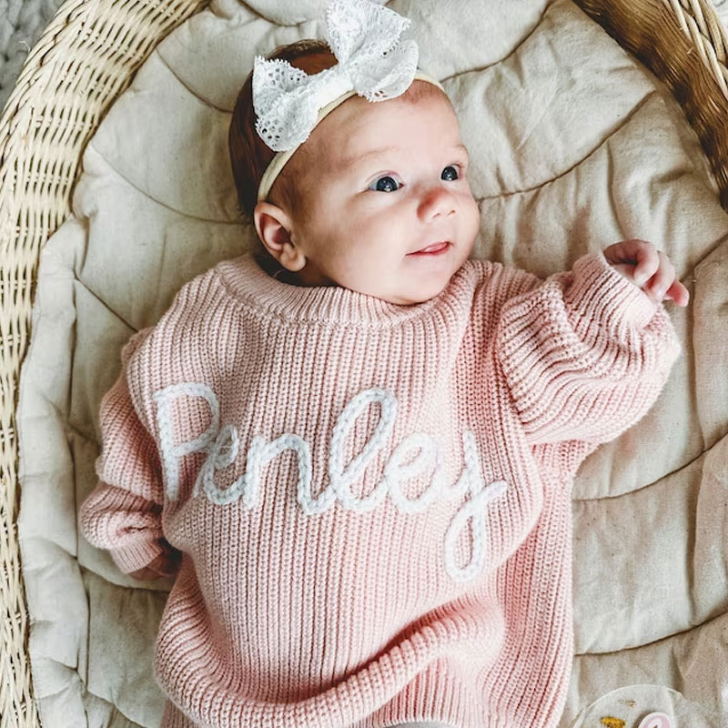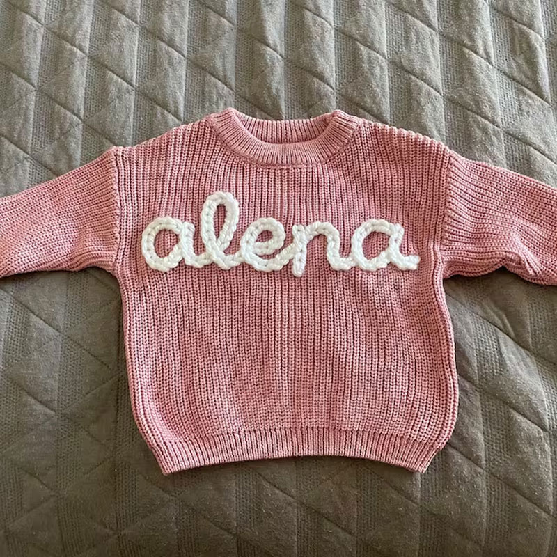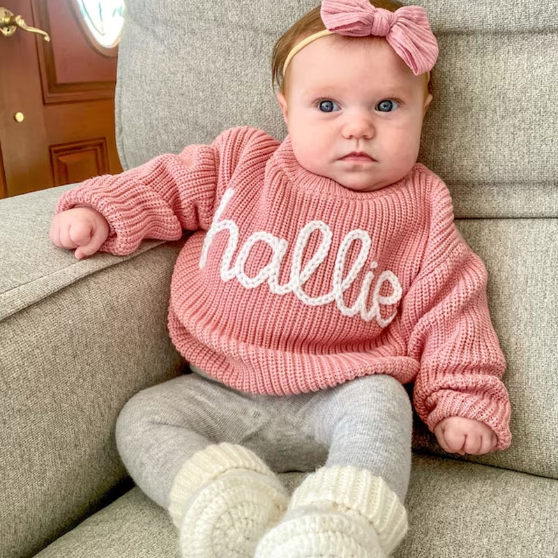 A custom baby name sweater is an adorable addition to your child's wardrobe, a great way to announce your baby's name to the world, and would make an amazing baby shower present.